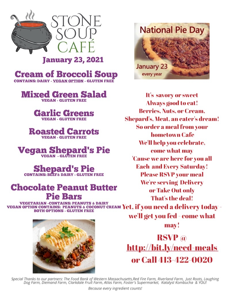 It's savory or sweet, always good to eat! Berries, Nuts, or Cream, Shepard's, Meat, an eater's dream! So order a meal from your hometown café! We'll help you celebrate, come what may, 'cause we are here for you all each and every Saturday! Please RSVP for your meal. We're serving delivery or take-out only... that's the deal!