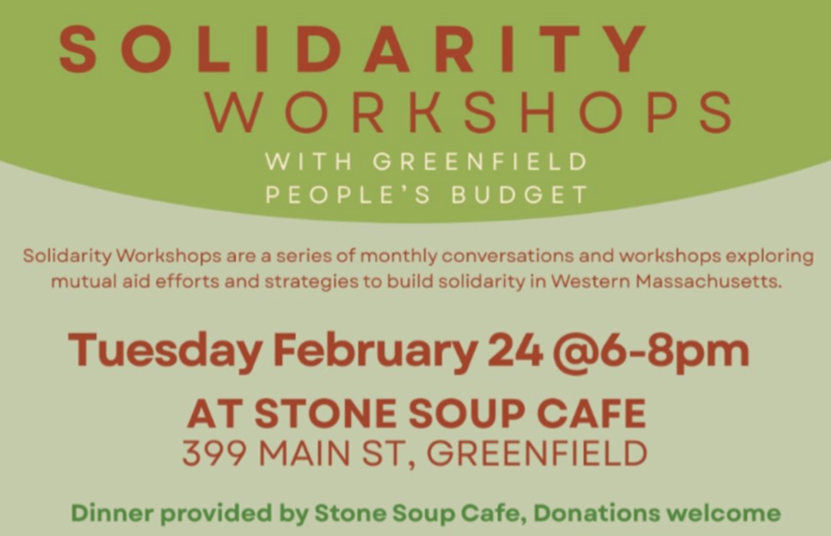 Tuesday , Feb 24th, 6-8PM - This month's conversation with Greenfield People's Budget explores how community members can engage in local government to shape policy and budget decisions rooted in justice and abolition. They are advocating for a city budget that residents write themselves through a process of participatory budgeting. Come learn more! Stone Soup will be serving a free dinner during the conversation. This workshop is part of a larger series organized by Building Solidarity Economies, focused on mutual aid efforts, centering real examples, with clear ways to plug in. |