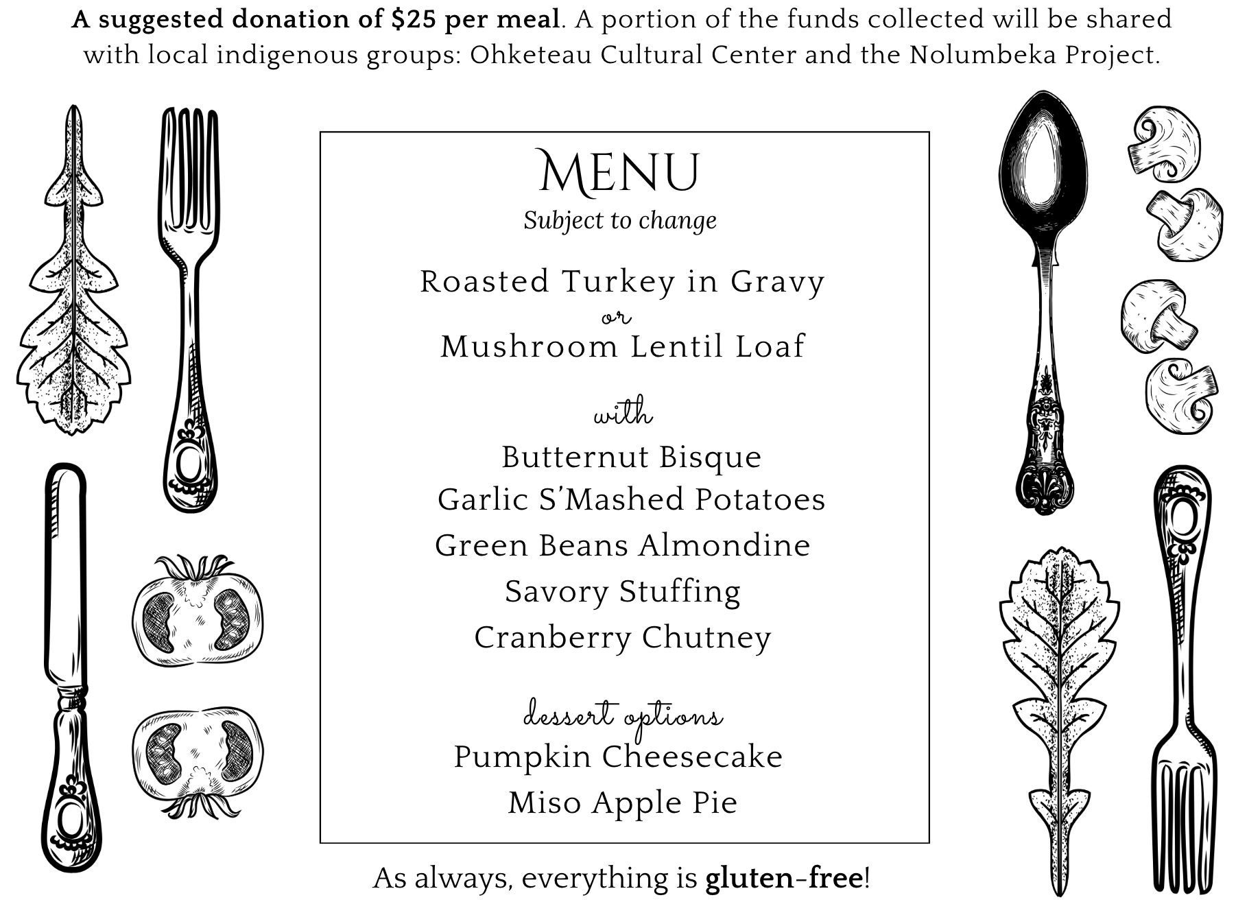 Suggested donation of $25 per meal. A portion of the funds collected at this meal will be shared with our indigenous friends at Ohketeau Cultural Center and Nolumbeka Project.