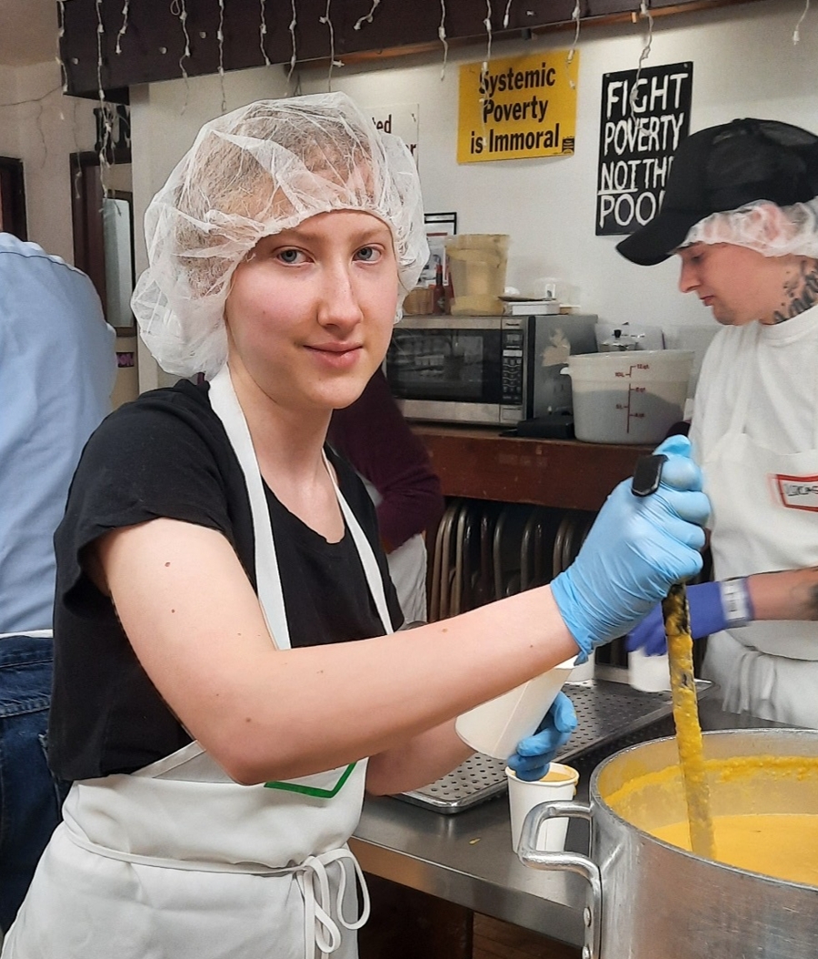 Allison is a remarkable member of our volunteer team here at Stone Soup Café. Allison's journey with us began after hearing about our mission through friends and a local youth group in Greenfield. Since March of 2024, she has volunteered every Friday and Saturday doing meal prep and food service. Incredible dedication! Allison is so dependable! She's smart, community/team-oriented, funny, communicates and listens well. She just turned 15, but her maturity, listening skills, focus, flexibility, and team relationship-building skills are incredible.