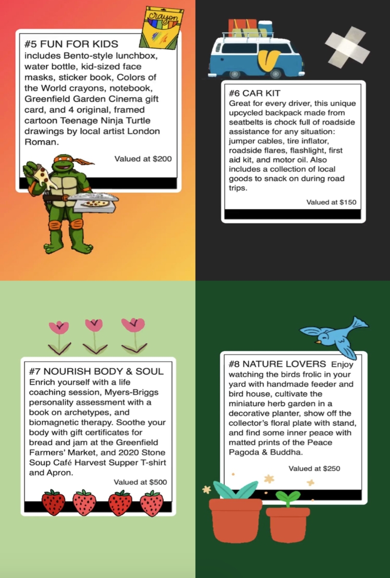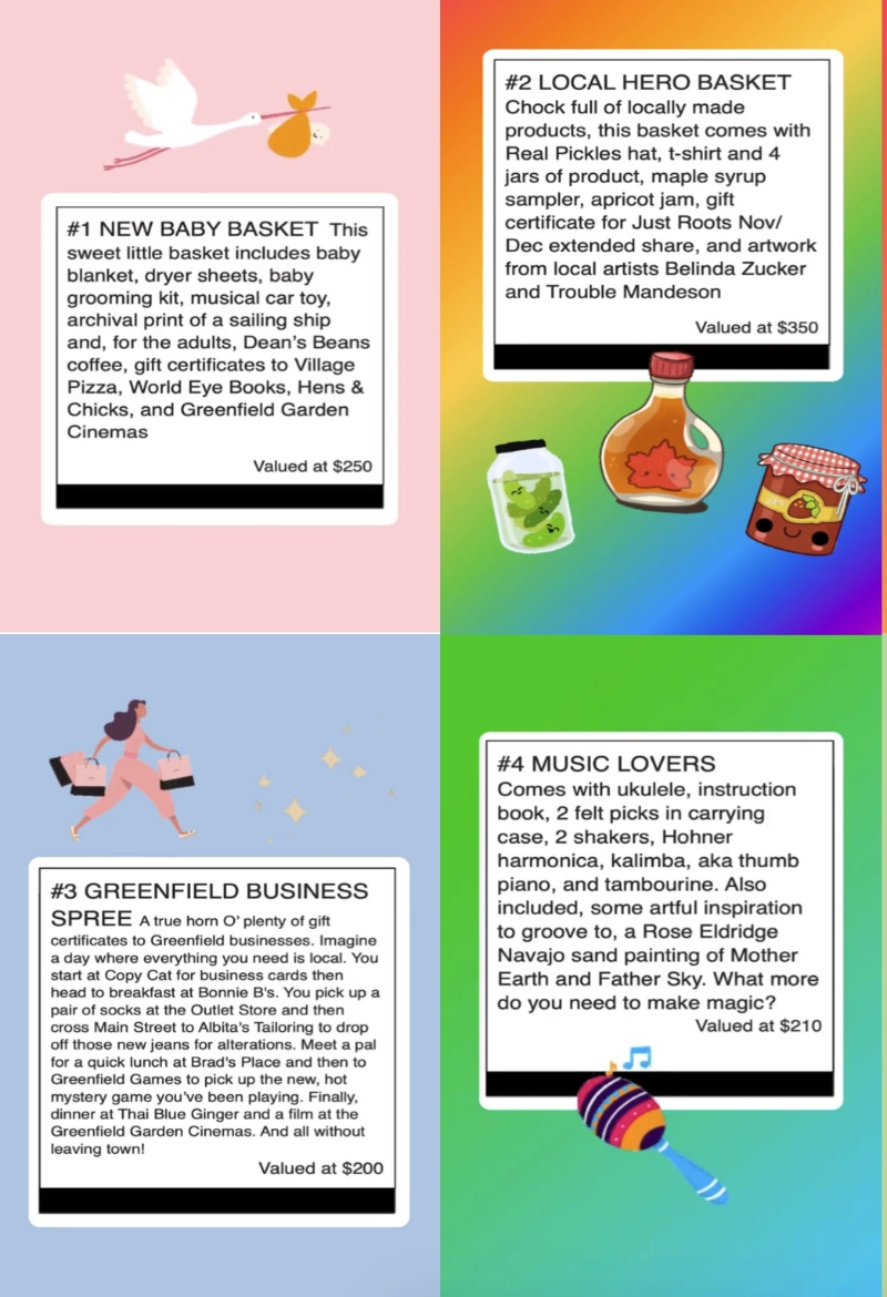 We have 8 different themed baskets that you can select from. They are high value with lots of local gift cards and goodies!