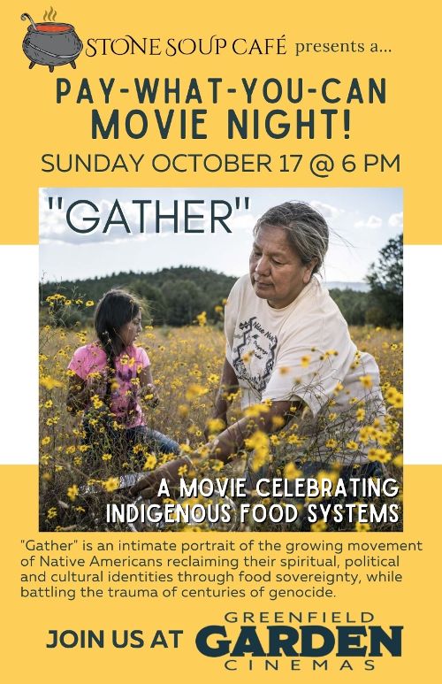Greenfield Garden Cinema has generously offered the use of their movie theater on Sunday, October 17th for a Pay-What-You-Can Movie Night! We will be doing an in-person screening of "Gather" on the big screen!! The film is a 2020 documentary by Sanjay Rawal about the growing movement amongst Indigenous Americans to reclaim their spiritual and cultural identities through obtaining sovereignty over their ancestral food systems, while battling against the historical trauma brought on by centuries of genocide.