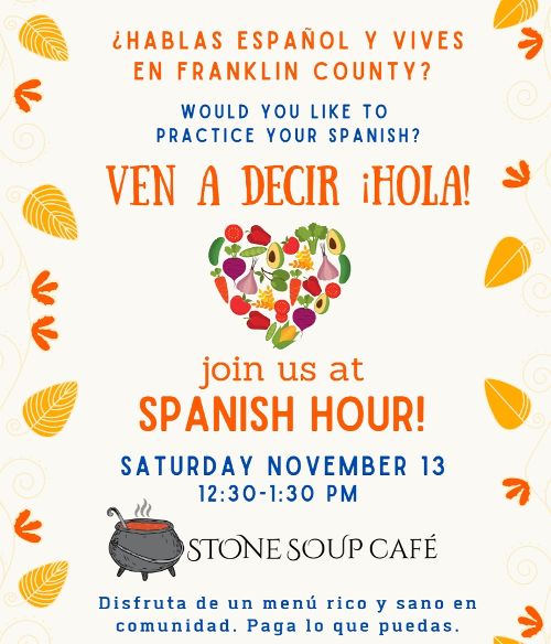 Last month our wonderful volunteer, Ester González, offered Spanish Hour -- an opportunity for folks to come together and speak Spanish with one another. We are hosting a second Spanish Hour on Saturday, November 13th from 12:30 - 1:30 PM at the Café, across the street from curbside pickup! Everyone interested in speaking Spanish is welcome to join and eat together.