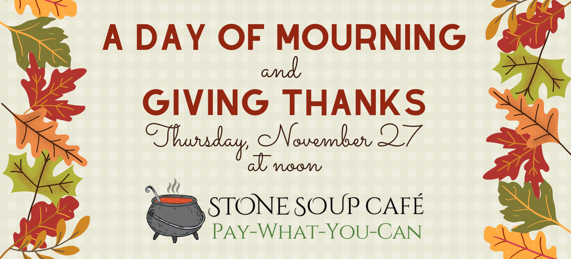 Join Stone Soup Café on this particular Thanks Giving Day to acknowledge, celebrate, and honor Indigenous resistance, while we share a delicious holiday meal that truly welcomes everyone. Thursday, November 27th, 2025 from 12 PM until 2:30 PM.